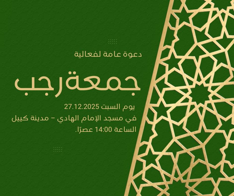 *Allgemeine Einladung* Die jemenitische Gemeinde in Deutschland lädt Sie herzlich zur *Rajab-Freitag-Veranstaltung* ein. Diese findet am Samstag, den 27. Dezember 2025, um 14:00 Uhr in der Imam-Al-Hadi-Moschee in Kiel statt.