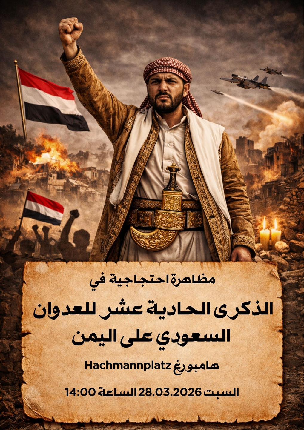 26مارس مظاهرة في هامبورغ – الذكرى الحادية عشرة للعدوان الذي تقوده السعودية على اليمن تنظم الجالية اليمنية في المانيا وبالتنسيق مع منظمات حقوقية مختلفة مظاهرة احتجاجية في الذكرى الحادي عشر للعدوان السعودي على اليمن العدوان الذي تسبب في قتل الالاف من ابناء اليمن وتدمير مقدرات الشعب اليمني وحصار اليمن برا وجوا وبحرا والتي مازالت اثاره وتاثيراته قائمة حتى اليوم. لذا ندعوكم للمشاركة الفاعلة يوم السبت القادم 28.03.2026 الساعة 14:00 ظهرافي مدينة هامبورغ وتحديدا في Hachmannplatz بجوار Hamburg Hauptbahnhof كونو صوت المستضعفين في اليمن