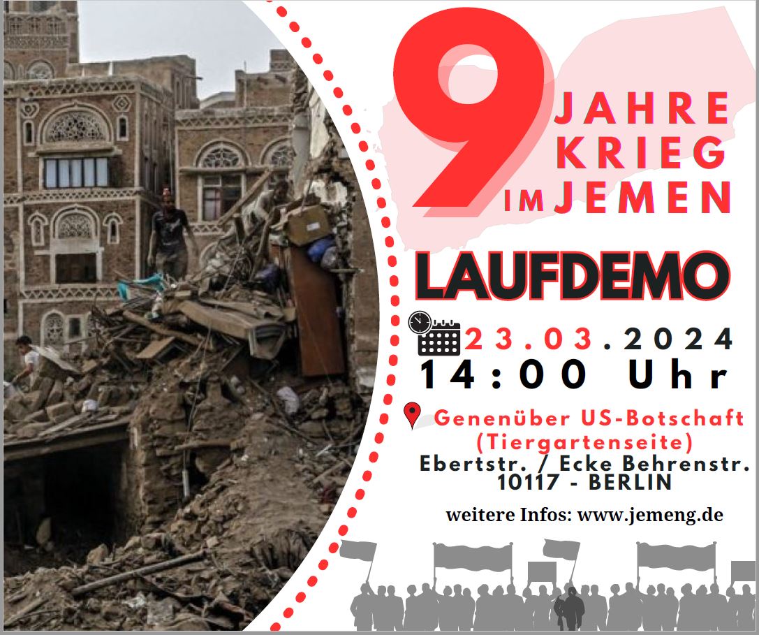 Eine Einladung zum Solidaritätsmarsch mit Jemen und Gaza am 23. März 2024 – Berlin9 JAHRE KRIEG IM JEMEN, ZEIT FÜR FRIEDEN! 23.03.2024 - Berlin: Neun Jahre US/Saudi/Emirati/NATO-Krieg im Jemen - 26. März 2015 - 26. März 2024 Gemeinsam für Frieden im Jemen und Palästina! Protestumzug von der US-Botschaft zum Kanzleramt zum 9. Jahrestag der US/Saudi/Emirati/NATO-Aggression gegen den Jemen und Solidaritätsbekundung mit dem Volk Palästinas! VERANSTALTER: Stop the WAR